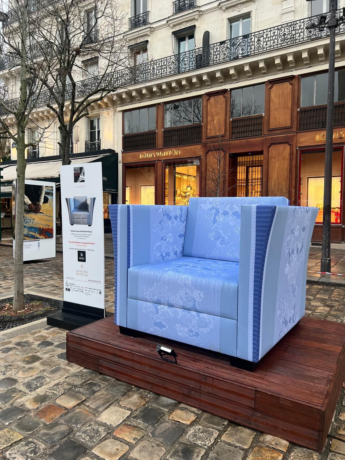 Fulcro di un percorso tessile ideato da Paris Déco Off, una poltrona fuori scala rivestita con il nostro tessuto Promenade Impériale si è imposta come un vero oggetto manifesto. Realizzata dalla Maison Collinet Sièges et Mobilier, anch’essa insignita del marchio Entreprise du Patrimoine Vivant, questa poltrona d’eccezione ha richiesto oltre 100 ore di lavoro. Pensata come dimostrazione di maestria e precisione, ha trasformato il tessile in una materia di espressione a sé stante, rivelando tutta la ricchezza del jacquard e la nobiltà del gesto artigianale.